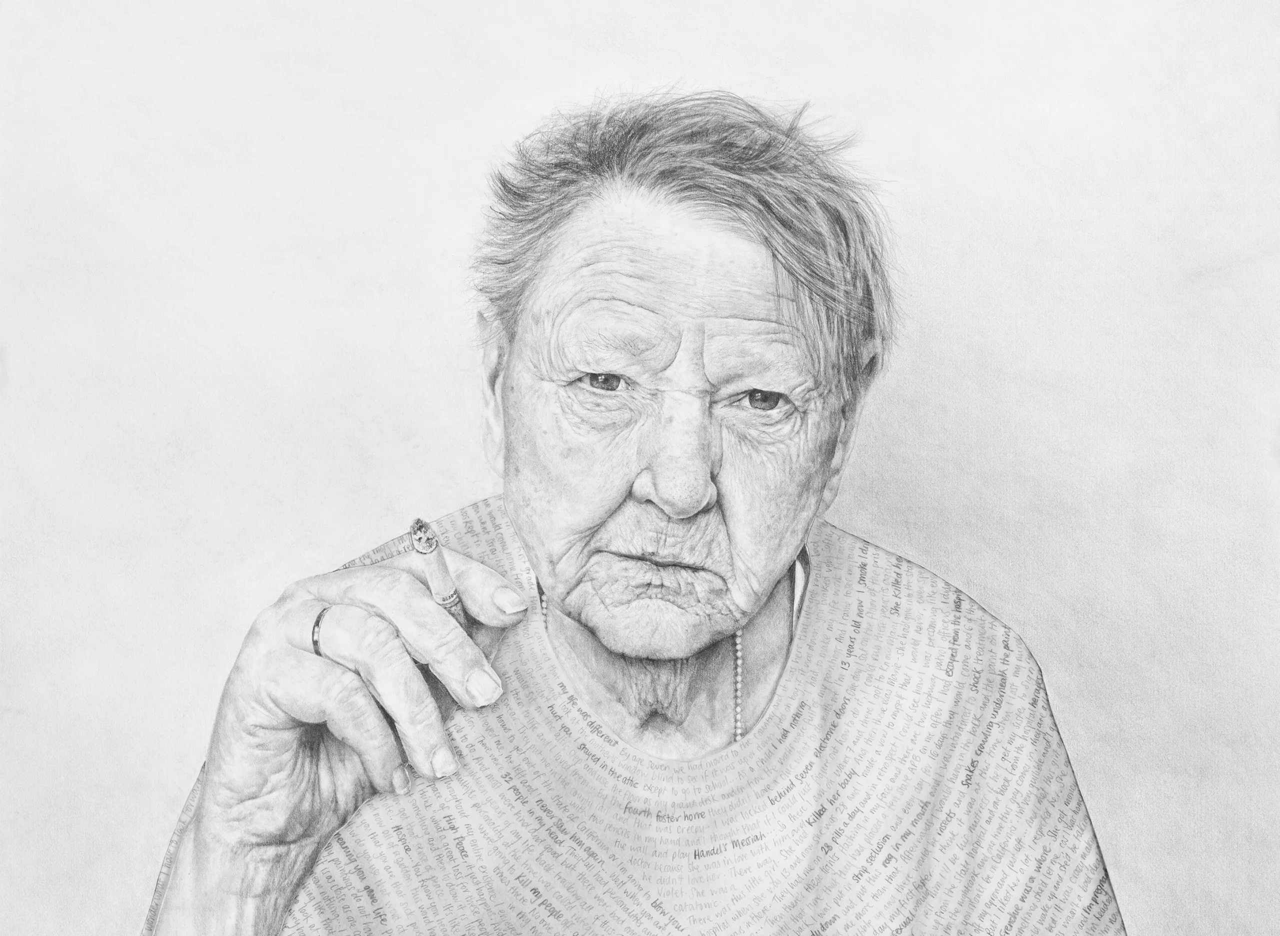 Over the course of two years, the San Francisco artist, born in London, spent time with nine hospice patients who had each been told they had six months or less to live. She recorded their conversations and spent 40 to 50 hours drawing a life-size portrait of each subject, writing their words onto their clothing and accompanying each with a three-minute audio clip edited down from their hours of reflection.