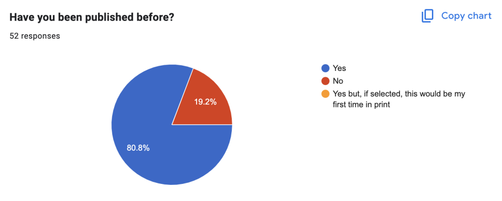 We included an optional demographic survey in the submission form, the results of which you can see below:
